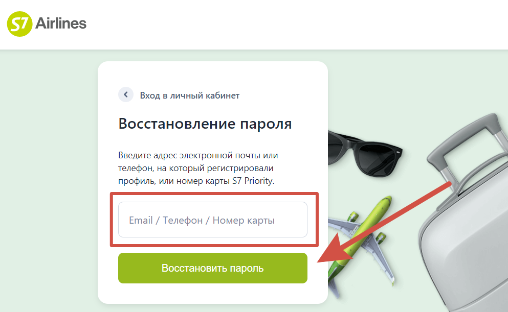 - Зайдите на страницу восстановления пароля: https://myprofile.s7.ru/processingConfirmation.