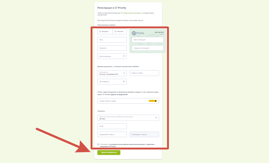- Если у вас имеется карта «S7 Priority» впишите номер карты.